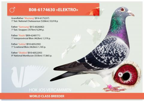 His 1° prize winner against 2,493 birds is a 50% Hok Jos Vercammen pigeon. The mother is a direct Vercammen bird. She is a daughter to “Beauty Elektro”(BE16-6032176) and a granddaughter to “Elektro”(BE08-6174630).