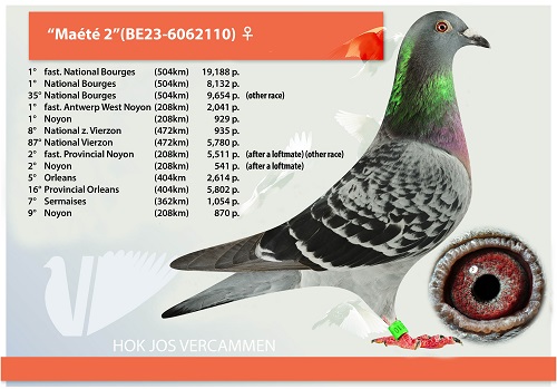 The checkered cock BE22-6020490 they mentioned was bought on the auction website PIPA. He is bred from “Golden Elektro”(BE19-6016058) x “Panda”(BE19-6016017) and is indeed a full brother to our super hen “Maété 2”(BE23-6062110). “Maété 2” put the crown on our wonderful 2025 year by winning 1° fast. National Bourges (504km) 19,188 p.!